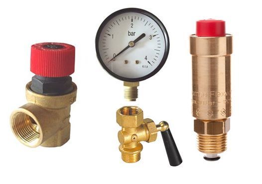 Komplektis kaitseklapp, manomeeter, ventiil ja õhueraldi.